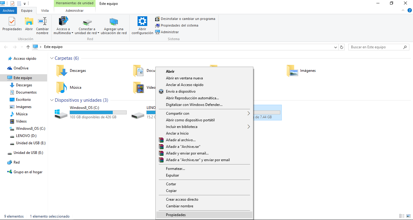 3. Ubicamos la USB, damos clic derecho, y a continuación pulsamos en "Propiedades".